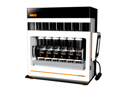 2 將裝有樣品的濾袋套在玻璃淋洗架上,淋洗架依次掛在淋洗轉(zhuǎn)盤上,待測(cè)樣品少于12個(gè)可放空淋洗架保持旋轉(zhuǎn)平衡,用專用把手把淋洗轉(zhuǎn)盤連淋洗罐放在加熱板中心位置上。